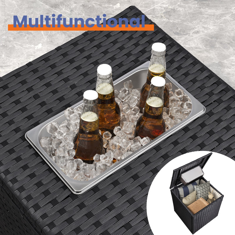 - The storage cabinet includes an ice bucket to keep drinks and wine chilled in the hot summer. [